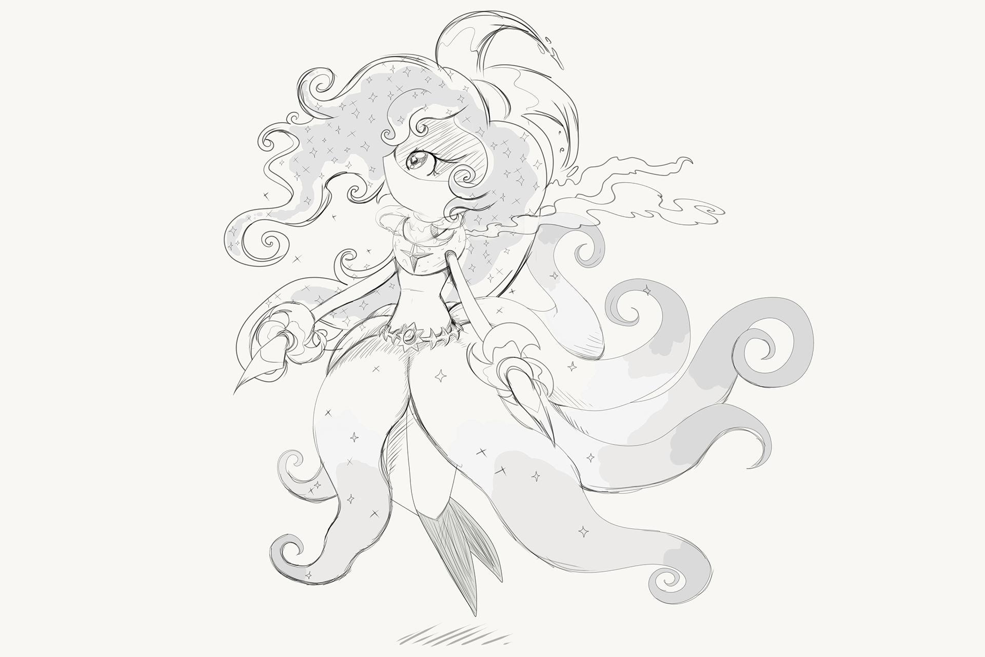 That finally changed this year. Chelsey had thought about the way Blackhole might look many times over the years, but she’d never got anything committed to paper, and honestly I can’t blame her. Designing your primary antagonist – and not just that, but the antithesis of a character like Galaxy, who so much work has gone into and we’re both so happy with – is hard work and can’t be taken lightly. Nevertheless, things got to a point where we decided it was time to just go for it. We talked about how Blackhole might look, considering different avenues for inspiration, before Chelsey finally came up with the idea of tentacles. It made a lot of sense, since visually there’s a similarity between them and the swirls present in Galaxy’s design.