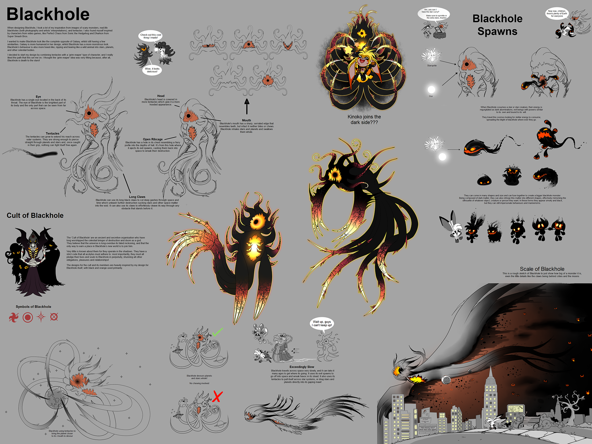 Inspiration also came from an image released by NASA back in 2019, in which a black hole and its shadow were captured for the first time. You’ve probably seen it yourself. We observed, as I’m sure many others have, that the black hole in the image looked sort of like an eye, staring back at us from across the void of space. Honestly, it’s quite a scary image when you start thinking of it as an actual monster lurking in space, like Blackhole himself! Blackhole’s colour scheme of black and orange came directly from that image, as did the eye at the back of his throat.
