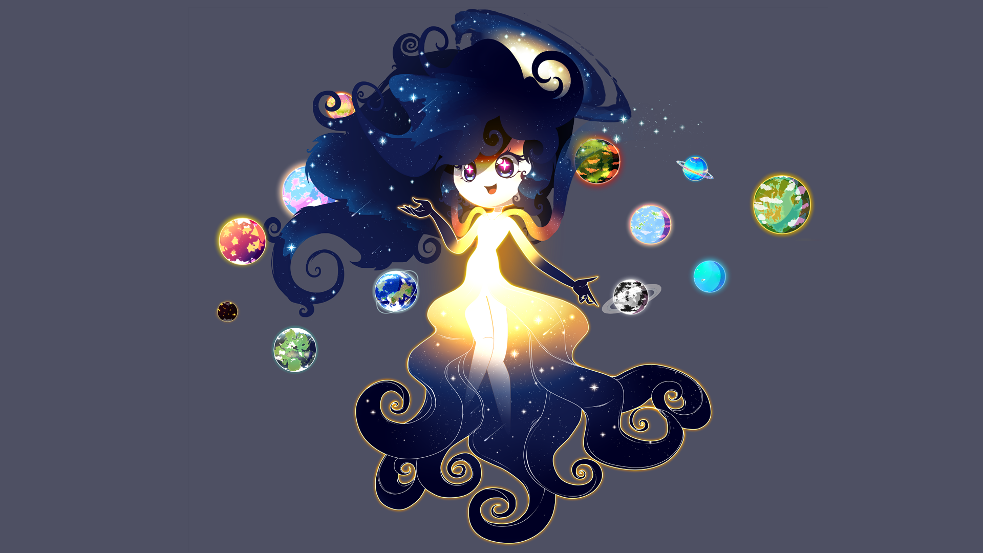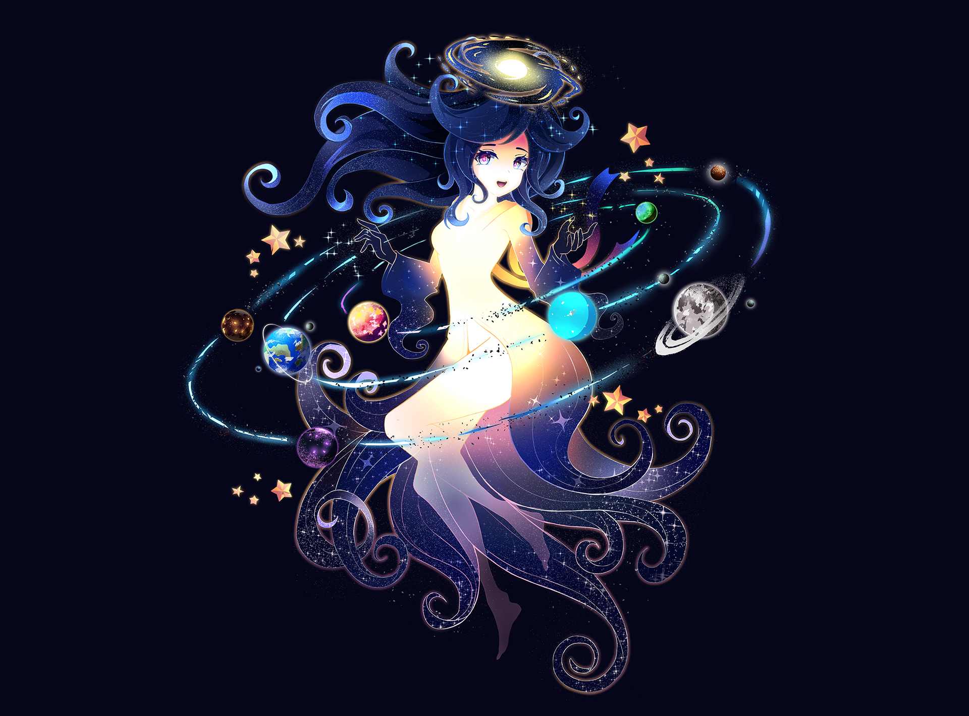 Eight years have passed since then, and Galaxy’s design has gone through several iterations, with her design gradually becoming what it is today. Her hair and ‘dress’ have been designed to resemble the swirling form of a spiral galaxy. Her colour scheme has changed substantially, from its original vibrant blues and purples, to a simpler palette of a dark, space blue and a radiant white-gold. She’s often drawn surrounded by planets, showing her magnificence, and the ease and love with which she creates them.
