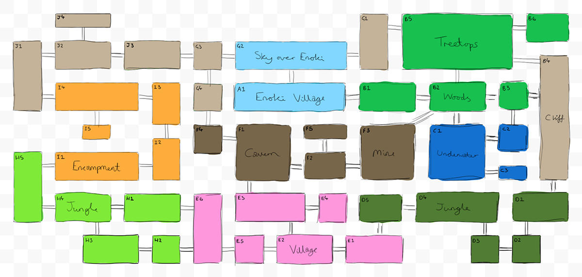 Our starting point was the map above, which is something we worked on together a couple of weeks ago. When coming up with an overall layout for the Fungaia world, we were keen to introduce a range of environments. We believe this will help to keep things fresh and interesting as the player moves through the world and discovers more areas, but also help them with pathfinding, since – as with any Metroidvania game – there will be plenty of navigating and backtracking required here. We’ve got woods, cliffs, jungles, tribal villages, alien encampments and more, and that’s just the first planet!