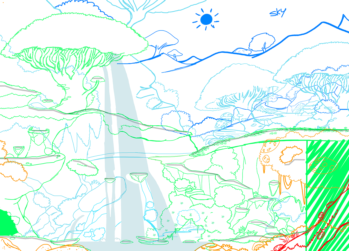 The screenshot above demonstrates one of the individual level designs that Chelsey has put together this month, corresponding to tile B2 on the Fungaia overview map. The thick grey lines she’s used here indicate platforms that can be stood or walked upon, so you can probably see that the level has quite a few different paths running through it, and that will be a recurring thing across all levels, with many of them having multiple entrances and exits which might even be unlocked at different stages of the game. The colours she’s used here correspond to sorting layers, with the light/dark blue areas representing the background, the green areas representing the game space, and the orange/red layers representing the foreground.