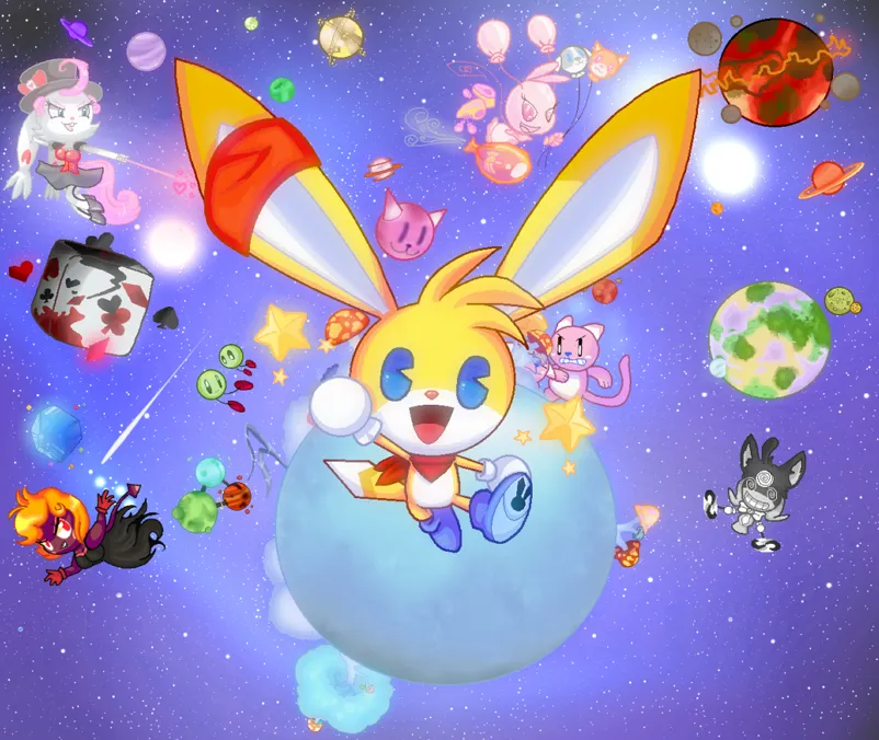 But Kinoko came about when Chelsey decided to create an in-universe video game for her characters to play. It was a console game starring that rabbit from outer space named Hoppers, and for a while Kinoko was just that – Hoppers, the video game character. Chelsey continued to work with her other characters for a while, but Kinoko began to pop up more and more in her drawings of them, and gradually she became more interested in him than she was in them!