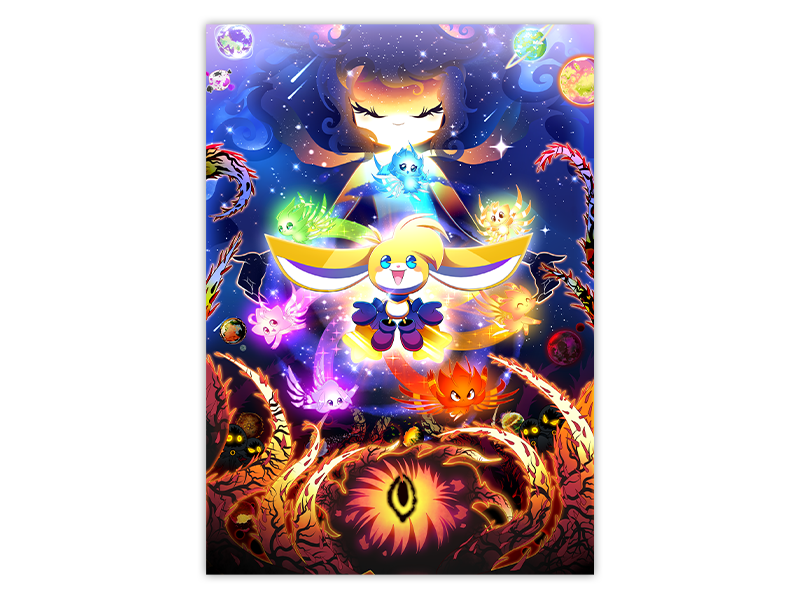 And secondly, the art print. This A4-sized print features Kinoko and his starsprite companions, along with both gods: the universe’s creator Galaxy, and her first-born turned destroyer, Blackhole. It’s printed on premium glossy paper and we think it’d look great whether framed or unframed.