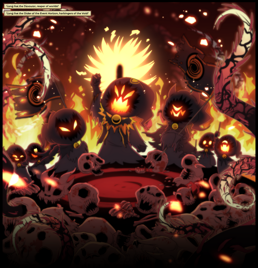 All across the universe, many have sought to appease Blackhole and spare themselves from his wrath. Others have attempted to control him, without success. In the Milky Way Galaxy, his main followers are the Order of the Event Horizon: a shady, sinister cult headquartered on the planet Avernion, with hidden shrines and sanctuaries all over the galaxy. These cultists worship Blackhole as a deity of destruction and chaos, and for thousands of years they have sought to gain his favour and earn their place in his new world order.