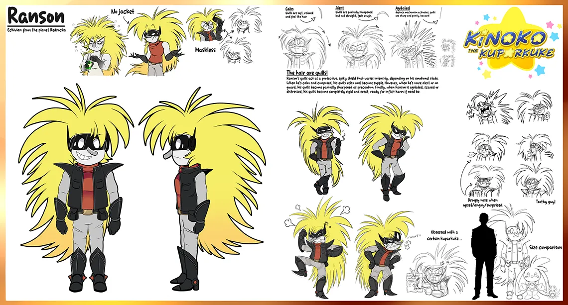 Compared to kuparkukes, Ranson is a tall and intimidating humanoid figure. He has two arms and two legs, but he also has four eyes and grey skin, and a long snout. He has a distinctive mane, which is exceptionally large, shaggy and yellow, and comprised not of actual hair, but of long, razor-sharp quills, which – as a natural defensive mechanism – become rigid when he’s agitated, scared or distressed, and which can be shot at his foes, though he has no control over this. His hands and feet are black and clawed, adapted for digging.