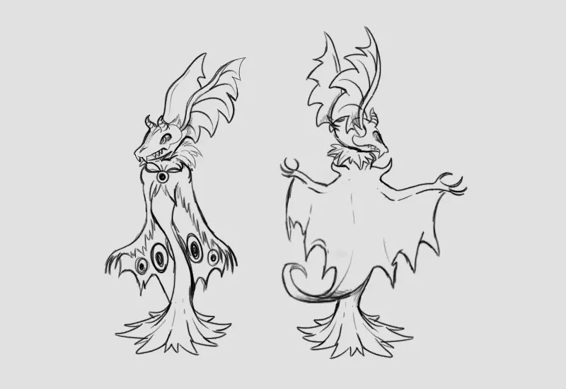 Vacio is a shadowdrifter: a tall, winged creature with a thin, black body and a chalky white, skeletal face. He has large, pointed ears and long, draping wings which, on their insides, are all a bright, burning orange. His face is long and pointed, with both fangs and horns. Both of his wings bear the unholy mark of the Order of the Event Horizon, by which he has been irreversibly branded for life. His eyes are deep and sunken in his skull, and are a piercing, predatory orange. His fingers are long and sharp, resembling claws.