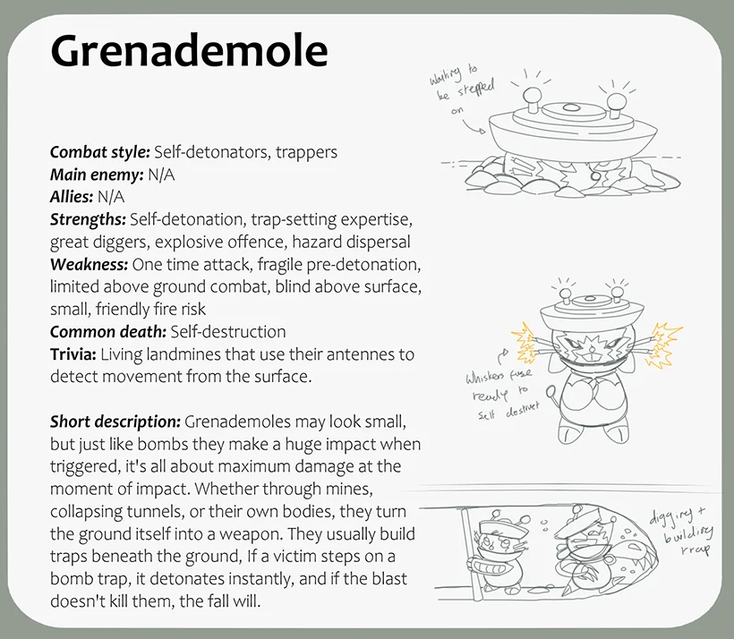 Grenademoles’ main form of attack comes in the shape of burrowing themselves below ground, where they lie in wait for their enemies to inadvertently step on them. When this happens, the grenademole detonates instantly. Using their antennae, they can also detect movement above the ground in order to position themselves directly in their enemy’s path. Despite this, they rarely attack lone targets, but instead await larger groups, preferring to use their one chance of attack in order to take out as many targets as possible.