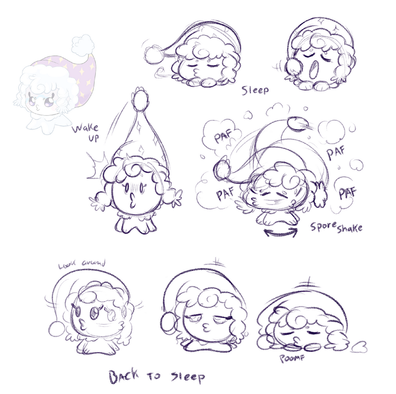 Each sleepycap bears the appearance of wearing a distinctive, puffy hat, though this is in fact a part of its body. This appendage carries a bubble-like bulb at the tip which is responsible for releasing the sleepycap's spores and putting those who awaken them to sleep. Their heads are relatively very large compared to their bodies. Unlike most fungus, sleepycaps do also have tiny hands and feet, though they use them little, what with spending most of their time nestled in the earth, fast asleep.